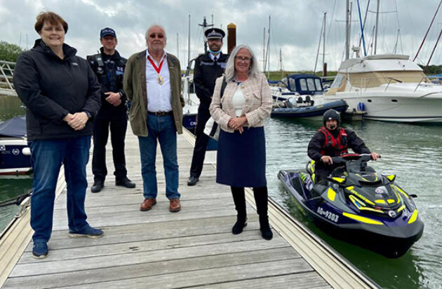 Deputy Essex PFCC Jane Gardner, Sgt Alex Southgate, Mayor of Maldon Cllr David Ogg, ACC Andy Prophet and Maldon District Cllr Wendy Stamp were at Burnham Marina to unveil the new personal watercraft.[/caption]