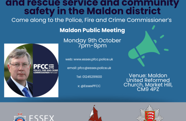 The Police, Fire and Crime Commissioner (PFCC), Roger Hirst, will be holding an in-person public meeting in Maldon District on Monday 9th October 2023 at 7pm to 8pm.