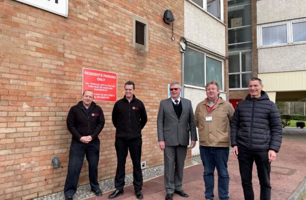 Mark Earwicker and Chris Parker from Essex County Fire and Rescue Service, PFCC Roger Hirst, Cllr Ian Gilbert and Paul Longman from South Essex Homes outside Cecil Court in Southend.[/caption]